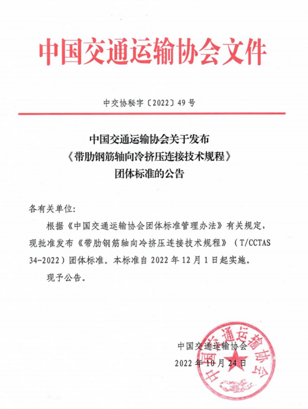 《带肋钢筋轴向冷挤压连接技术规程》由中国交通运输协会新技术促进分会提出,由中铁工程设计咨询集团有限公司牵头,联合杭州安克徕斯新材料科技有限公司、中国铁道科学研究院集团有限公司、中国铁路经济规划研究院有限公司、青岛铭功建筑工程科技有限公司等32家单位共同起草,于2022年10月24日发布,12月1日起实施。该标准规定了带肋钢筋轴向冷挤压连接的基本规定、接头应用、型式检验、现场安装、检验与验收等,有利于提高钢筋混凝土结构施工的钢筋连接技术水平,规范轴向冷挤压钢筋连接技术的设计、施工及验收。