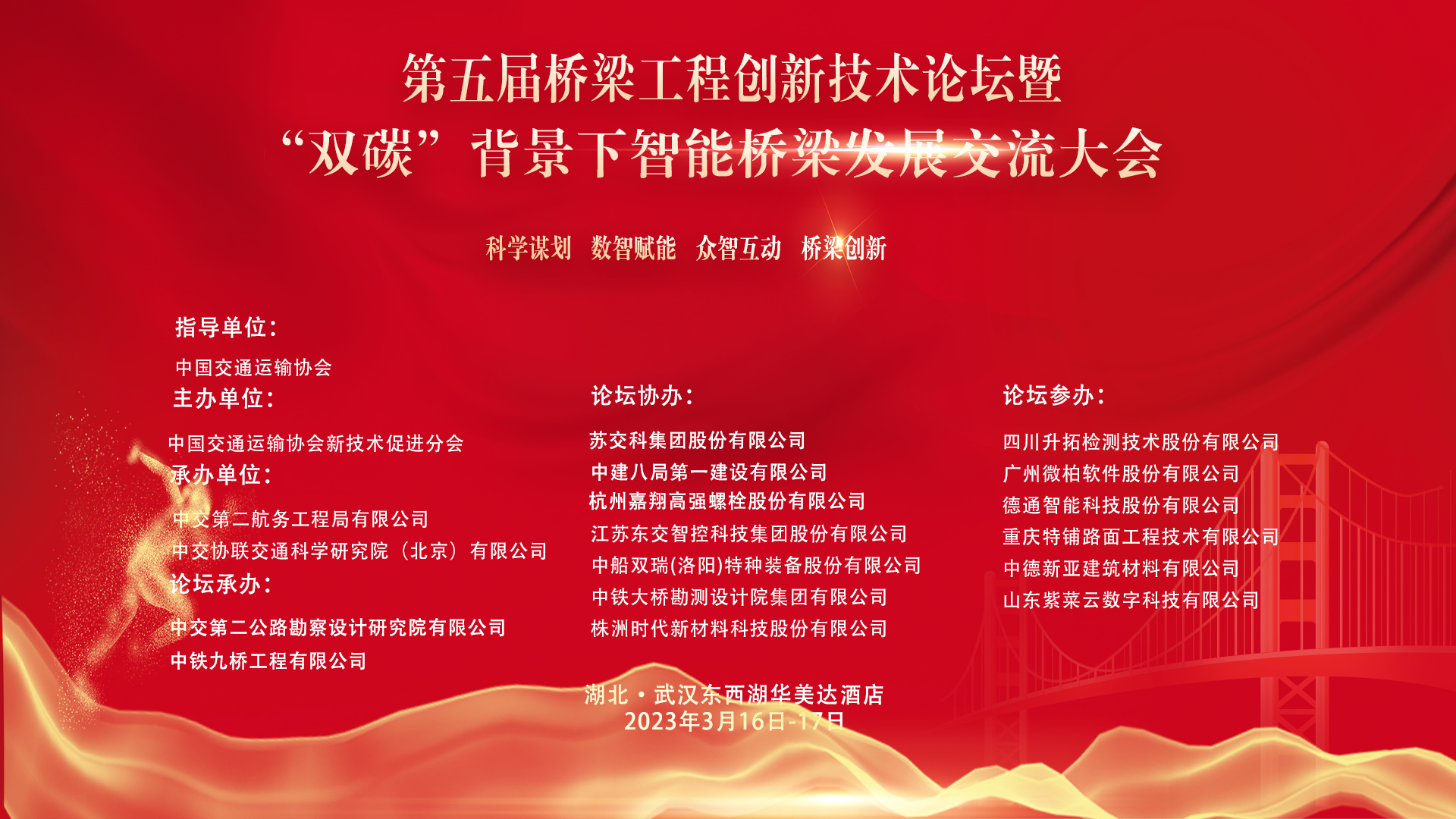 我国《国家综合立体交通网规划纲要》中提出“坚持创新核心地位,注重科技赋能”。智能桥梁具有安全、智能、绿色的基本特征,符合国家发展方向更是推动行业高质量发展的重要抓手。为实现智能设计、智能建造、智能管养、智能使用的新一代桥梁工程,中国交通运输协会新技术促进分会定于2023年3月16-17日在武汉举办“第五届桥梁工程创新技术论坛暨‘双碳’背景下智能桥梁发展交流大会”。